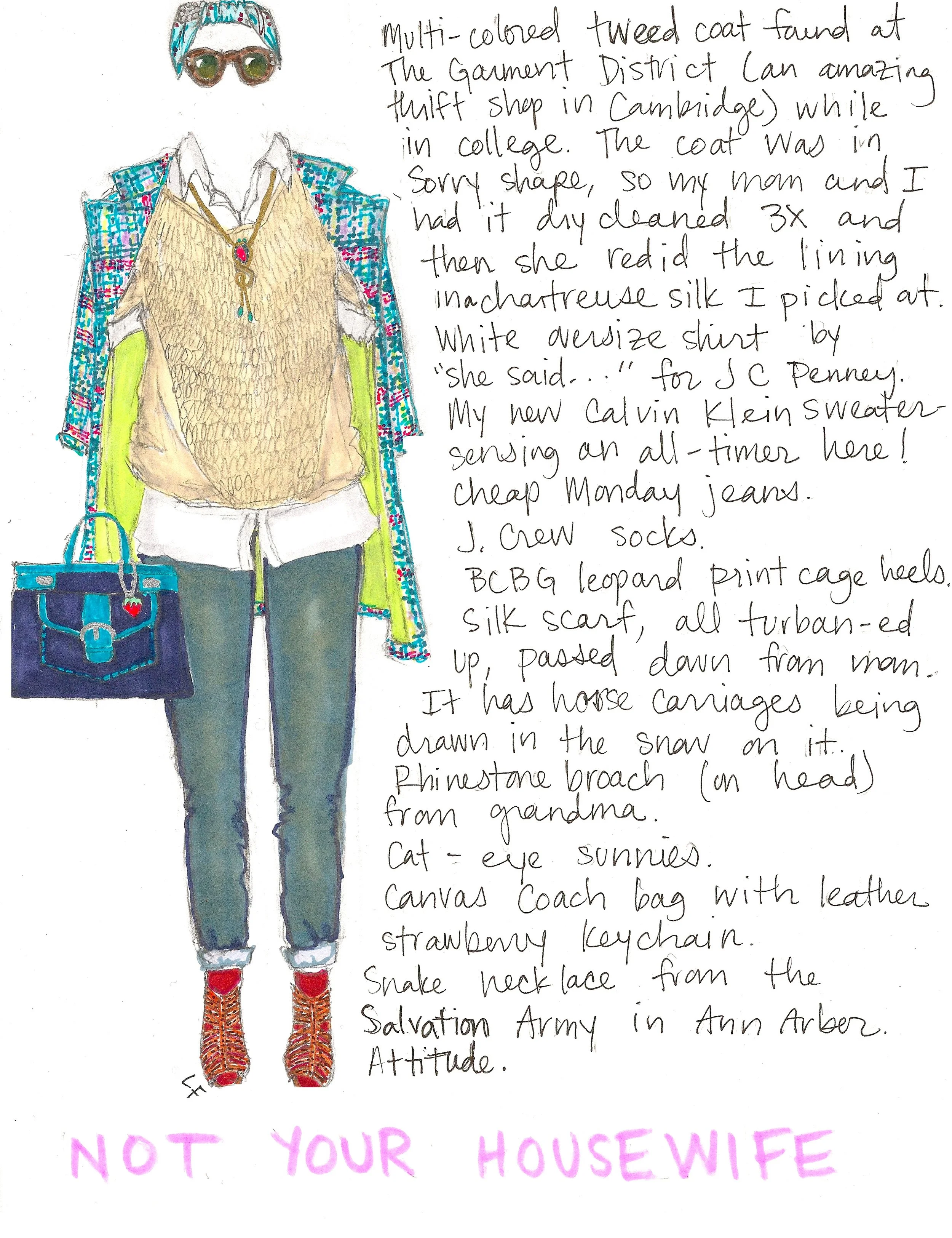 I remember my mood when I originally drew this sketch - "man repelling" was just becoming a thing, and I relished the creation of an outfit that was unabashedly a mix-up of colors, textures, and aesthetics regardless of what the opposite sex considered attractive.